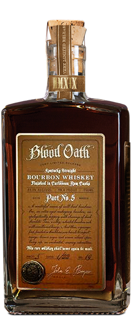 Blood Oath Pact 5 is a masterful union of three well-bred bourbons. One, a 13-year mahogany bourbon, un‑apologetically peppery with shavings of dark chocolate. Two, an 11-year silky, wheated bourbon rich with vanilla and honey. And three, an 8-year find, finished in Caribbean rum barrels to impart orange, brown sugar and warm island spice. Every sip, an uncharted, sensory adventure.INGREDIENTS